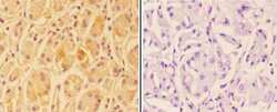 - Immunohistochemistry analysis of A20A3 in paraffin-embedded human stomach carcinoma tissue (membrane and cytoplasmic staining) and negative control (right, with PBS only). Samples were incubated with A20A3 polyclonal antibody (Product # PA5-75792) at a dilution of 1:50, followed by goat Anti-Rabbit IgG-biotin and avidin peroxidase.