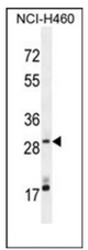 - Western blot analysis of MAGIX Antibody (C-term) ??in NCI-H460 cell line lysates (35ug/lane). This demonstrates the MAGIX antibody detected the MAGIX protein (arrow).
