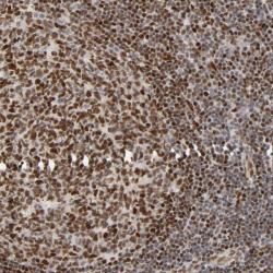 - Immunohistochemical staining of human lymph node shows strong nuclear positivity in reaction center cells and lymphoid cells outside reaction centra.