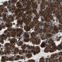 - Immunohistochemical staining of human pancreas shows strong cytoplasmic positivity in exocrine glandular cells.