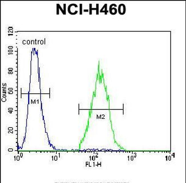 - Flow cytometric analysis of ARL17P1 in NCI-H460 cells (right histogram) compared to a negative control cell (left histogram). Samples were incubated with a ARL17P1 Antibody (Center) (Product # PA5-48244) followed by incubation with a FITC-conjugated goat-anti-rabbit secondary antibody.
