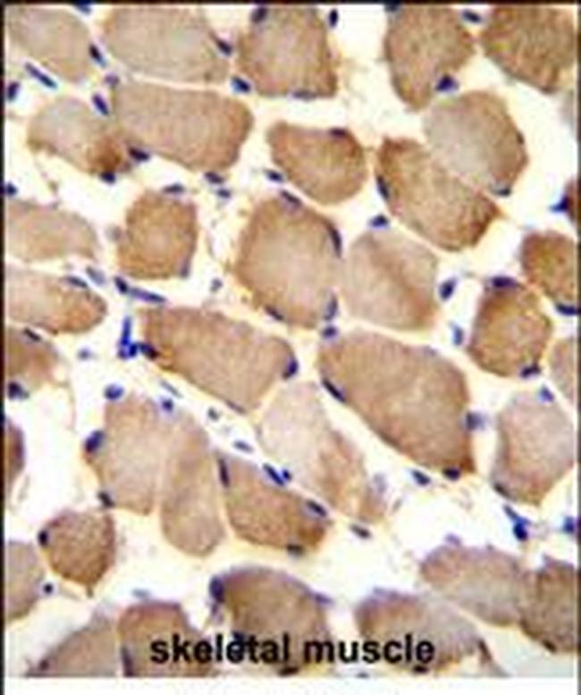 - Immunohistochemical analysis of ARL17P1 in formalin fixed and paraffin embedded human skeletal muscle tissue. Samples were probed with a ARL17P1 Antibody (Center) (Product # PA5-48244) followed by peroxidase conjugation of the secondary antibody and DAB staining.
