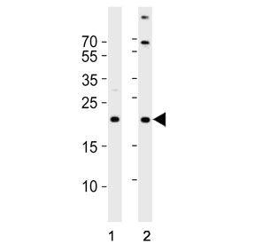 - Western blot testing of human 1) MCF7 and 2) A431 cell lysate with TIMM23 antibody. Predicted molecular weight ~22 kDa.