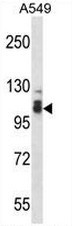 - SMEK2 Antibody (C-term) (Cat. #AP53945PU-N) western blot analysis in A549 cell line lysates (35µg/lane).This demonstrates the SMEK2 antibody detected the SMEK2 protein (arrow).