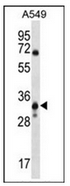 - Western blot analysis of MCART6 Antibody (C-term) in A549 cell line lysates (35ug/lane). This demonstrates the MCART6 antibody detected the MCART6 protein (arrow).