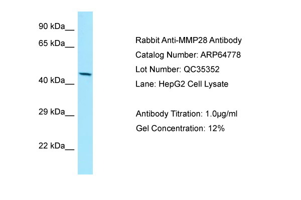 - WB Suggested Anti-MMP28 Antibody Titration: 1.0 ug/ml, Positive Control: HepG2 Whole Cell