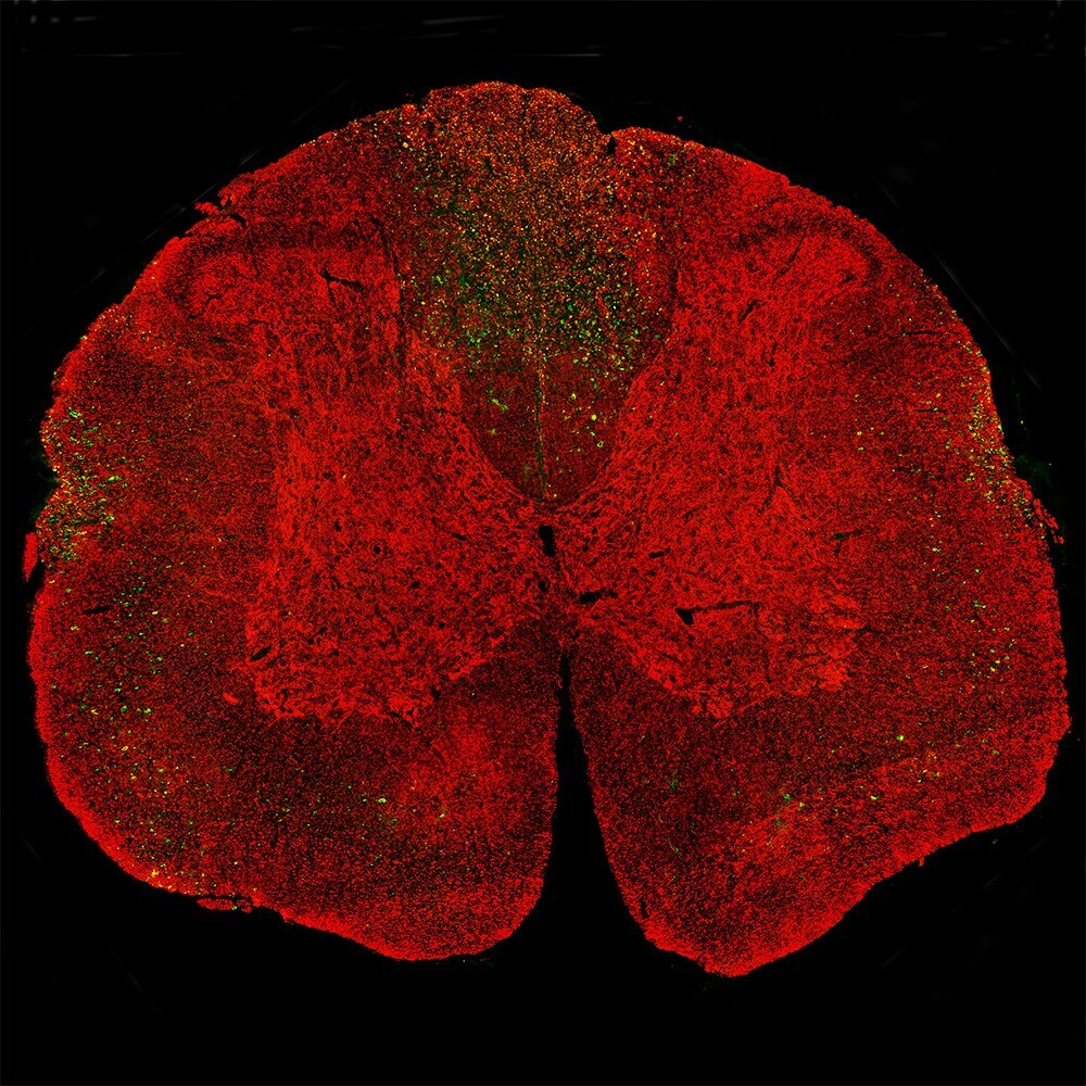 - Immunohistochemistry analysis of NEFL in coronal section of the spinal cord of a rat given a midline C4 contusion injury three days previously. Samples were stained with NEFL monoclonal antibody (Product # MA5-47382) in green. Costained with rabbit polyclonal antibody to neurofilament NF-L C-terminus in red. The NEFL antibody stains prominent aggregates of material concentrated in the lateral funiculi and the dorsal columns but seen in lesser amounts throughout the section. These are degenerating and degenerated axons damaged by the C4 lesion. The neurofilament NF-L C-terminus antibody binds the C-terminal "tail" region of NF-L which is absent or destroyed during degeneration, so the NEFL positive profiles are largely negative for neurofilament NF-L C-terminus antibody.