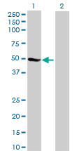 - Western Blot analysis of ZNF718 expression in transfected 293T cell line (H00255403-T01) by ZNF718 MaxPab polyclonal antibody.Lane 1: ZNF718 transfected lysate(52.58 KDa).Lane 2: Non-transfected lysate.