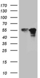 - HEK293T cells were transfected with the pCMV6-ENTRY control. (Left lane) or pCMV6-ENTRY ZNF718. (Right lane) cDNA for 48 hrs and lysed. Equivalent amounts of cell lysates. (5 ug per lane) were separated by SDS-PAGE and immunoblotted with anti-ZNF718. (1:2000)