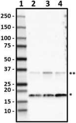 - Western blot of HRP anti-Histone H3 Dimethyl (Lys9) antibody (5E5-G5). Lane 1: Molecular weight marker; Lane 2: 20 µg of human brain lysate, Lane 3: 10 µg of mouse brain lysate, Lane 4: 10 µg of rat brain lysate. The blot was incubated with 0.5 µg/mL of the primary antibody overnight at 4°C. Enhanced chemiluminescence was used as the detection system. * The predicted molecular weight of dimethyl Histone H3 is at 17 kD. ** The possible homodimers are at 35 kD (Antigen References #1 and #2)