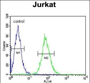 - Flow cytometry of GGNBP2 in Jurkat cells (right histogram). Samples were incubated with GGNBP2 polyclonal antibody (Product # PA5-25284) followed by FITC-conjugated goat-anti-rabbit secondary antibody. Negative control cell (left histogram).