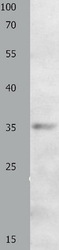 - Predicted band size: 35 kDa . Positive control: Human leiomyosarcoma tissue lysate. Recommended dilution: 1/200-1000. (Gel: 10%SDS-PAGE Lysate: 40 ug Primary antibody: 1/700 dilution Secondary antibody: Goat anti Rabbit IgG - H&L (HRP) at 1/10000 dilution Exposure time: 30 seconds)