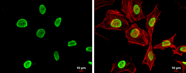- Histone H4K5K8K12K16ac (acetyl Lys5/Lys8/Lys12/Lys16) antibody detects Histone H4K5K8K12K16ac (acetyl Lys5/Lys8/Lys12/Lys16) protein at nucleus by immunofluorescent analysis.Sample: HeLa cells were fixed in 4% paraformaldehyde at RT for 15 min.Green: Histone H4K5K8K12K16ac (acetyl Lys5/Lys8/Lys12/Lys16) protein stained by Histone H4K5K8K12K16ac (acetyl Lys5/Lys8/Lys12/Lys16) antibody (GTX122653) diluted at 1:500.Red: phalloidin, a cytoskeleton marker, diluted at 1:200.Scale bar = 10 £gm.