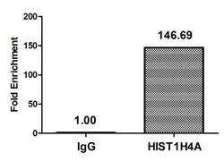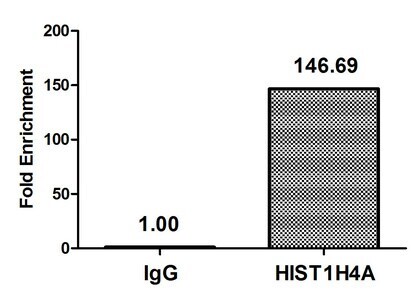 - Chromatin Immunoprecipitation analysis of H4K5cr in 4*10^6 Hela cells using a H4K5cr polyclonal antibody (Product #PA5-112543). Hela cells were treated with Micrococcal Nuclease, sonicated, and immunoprecipitated with 5 µg anti-HIST1H4A or a control normal rabbit IgG. The resulting ChIP DNA was quantified using real-time PCR with primers against the beta-Globin promoter.