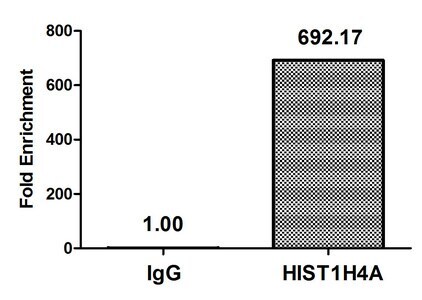 - Chromatin Immunoprecipitation analysis of H4K5pr in 4*10^6 Hela cells using a H4K5pr polyclonal antibody (Product #PA5-112545). Hela cells were treated with Micrococcal Nuclease, sonicated, and immunoprecipitated with 5 µg anti-HIST1H4A or a control normal rabbit IgG. The resulting ChIP DNA was quantified using real-time PCR with primers against the beta-Globin promoter.