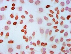 - Immunocytochemichal analysis of H4K5pr in Hela cells using a Polyclonal antibody (Product # PA5-112545) at a dilution of 1:100. Hela cells (treated with 10mM sodium propionate for 4h) performed on a Leica BondTM system. The cells were fixed in 4% formaldehyde, permeabilized using 0.2% Triton X-100 and blocked with 10% normal goat serum 30min at RT. Then primary antibody (1% BSA) was incubated at 4°C overnight. The primary is detected by a biotinylated secondary antibody and visualized using an HRP conjugated SP system.