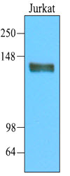 - Western blot analysis on Jurkat cells: Cell lysates of Jurkat (20 ug) were resolved by SDS-PAGE, transferred to NC membrane and probed with anti-human CD45 (1:2000). Proteins were visualized using a goat anti-mouse secondary antibody conjugated to HRP and an ECL detection system.