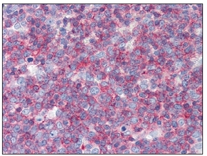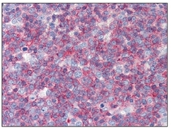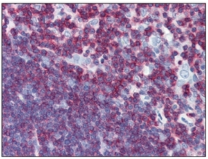 - Immunohistochemistry: CD45 antibody staining of Formalin-Fixed, Paraffin-Embedded Human Thymus at 10 ug/ml followed by biotinylated anti-mouse IgG secondary antibody, alkaline phosphatase-streptavidin and chromogen.