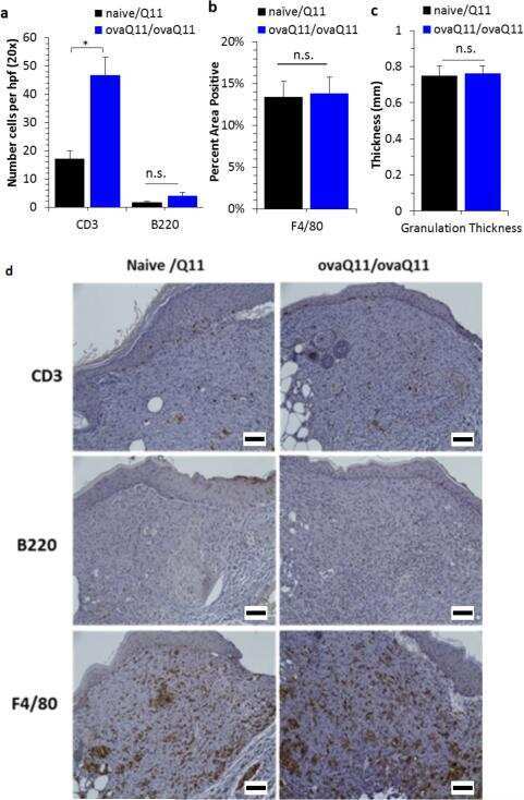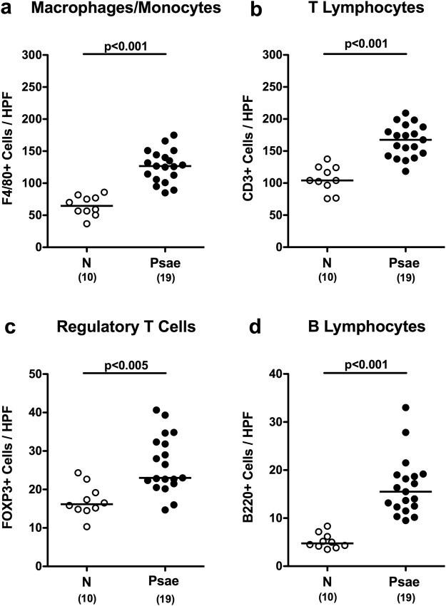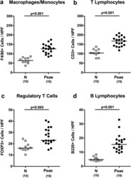 - Figure 4 Colonic immune cell responses in multidrug-resistant P. aeruginosa infected mice suffering from chronic colitis. IL-10 -/- mice with chronic colitis were perorally infected with a multidrug-resistant P. aeruginosa (Psae) strain on day (d) 0. Six weeks thereafter (on d42 postinfection; black circles) the average numbers of colonic ( a ) macrophages and monocytes (positive for F4/80), ( b ) T lymphocytes (positive for CD3), ( c ) regulatory T cells (positive for FOXP3), and ( d ) B lymphocytes (positive for B220) were determined from six high power fields (HPF, 400x magnification) per animal in immunohistochemically stained large intestinal paraffin sections. Naive (N) IL-10 -/- mice served as negative controls (open circles). Numbers of mice (in parentheses), medians (black bars) and significance levels (p-values) determined by the Mann Whitney U test are indicated. Data shown were pooled from three independent experiments.