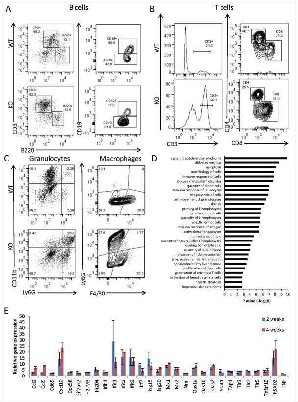 - Figure 3 Tpl2 reduced liver infiltration of pathogenic CD4 + T cells. Liver-infiltrating immune cells were isolated from P. acnes -primed WT and Tpl2 -KO mice at day 3, 5, and 7 as described in Materials and methods ( n = 4 mice/group). (A-G) Flow cytometry analysis of the frequencies and absolute numbers of CD4 + and CD8 + T cells, B220 + B cell, CD11c + dendritic cells (A-C) , CD4 + Foxp3 + Treg cells (D,E) , and IFN-gamma- and TNF-alpha-producing pathogenic Th1 cells (F,G) in the livers of WT and Tpl2 -KO mice at day 7 after P. acnes priming. Data are presented as representative plots of the frequencies of immune cell subpopulations (A,D,F) and a summary graph of the frequencies and absolute cell numbers (B,C,E,G) . (H,I) Flow cytometry analysis of the frequencies and absolute numbers of CD4 + T cells in the livers of WT and Tpl2 -KO mice at day 3, 5, and 7 after P. acnes priming. Data are presented as representative plots of the frequencies of immune cell subpopulations (H) and a summary graph of the absolute cell numbers (I) . Results are mean +- SD from three independent experiments. Two-tailed Student's t -tests were performed. * P < 0.05; ** P < 0.01.