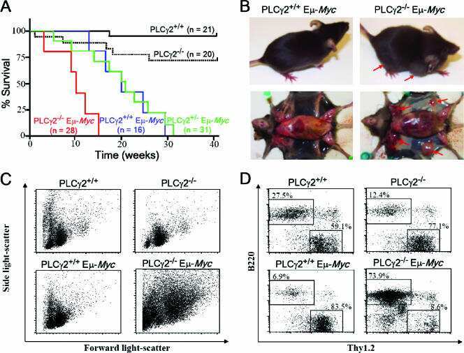 - Figure 2 Analysis of the B lymphocyte populations expanded in TRAF3/BCL2 double-tg mice with lymphoid dyscrasias. Three-color flow-cytometry analysis was performed to determine the phenotype of expanded B lymphocyte populations. Gating of the expanded population was based on the CD45R/B220 and FSC plot of each sample analyzed and is indicated in the figure. The surface molecules analyzed are indicated in the plots, as well as the percentage of cells found in each quadrant. The quadrants settings were selected based on the staining of isotype-controls (not shown). The tissue source where the analyzed lymphocytes were extracted from and the type of B cell malignancy developed by the TRAF3/BCL2 double-tg mice, according to the flow-cytometry and immunohistochemical analysis, is indicated in the figure.