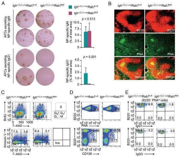 - Figure 4 Loss of memory B cells in the absence of Atg7 ( a , b ) DUMP - B220 + IgG1 + CD38 + NP + memory B cells in the spleen of B/ Atg7 -/- mice or WT controls eight weeks after immunization. Unimmunized mice were used as negative controls (a). Total NP-specific memory B cells in the spleen are presented in (b). ** P