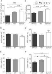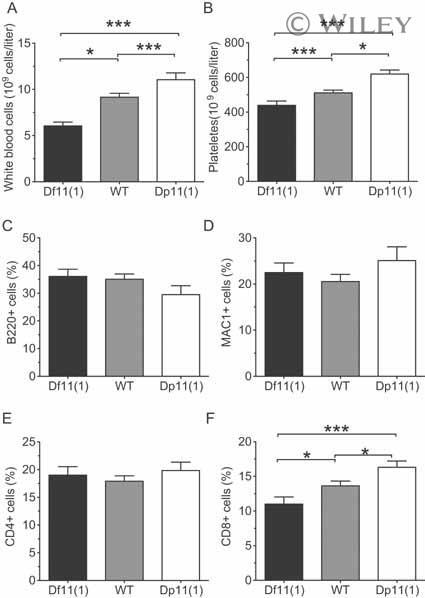 - 5 Peripheral blood cytometry. A,B. A significant positive gene dose-dependent effect was observed for (A) white blood cells, and (B) platelet counts at 12 weeks of age (mean +- SEM; Df11(1)/+, N = 21; WT, N = 41; Dp11(1)/+, N = 20 ; *P < 0.05, **P < 0.01, ***P < 0.001). C-F. Flow cytometry revealed a significant positive gene dose-dependent effect for percentage (F) CD8+, but not (C) B220+, (D) Mac1+, (E) CD4+ positive cells in peripheral blood (mean +- SEM; Df11(1)/+, N = 19; WT, N = 58; Dp11(1)/+, N = 25; *P < 0.05, **P < 0.01).