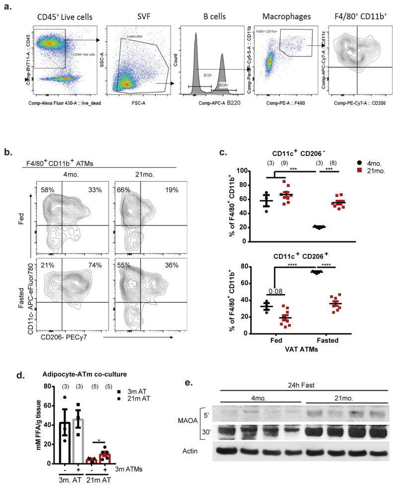 - Extended Data Figure 2 Age-related changes in ATMs in response to fasting, related to Figure 1 a , Representative gating strategy for ATM analyses. b , Representative contour plots of CD206 and CD11c expression within F4/80 + CD11b + ATMs from VAT of fed or fasted mice. Values represent mean for each condition from 2 individual experiments. Exact Ns are displayed in table 1. c, Quantification of CD11c + CD206 - (top) and CD11c + CD206 + (bottom) populations from panel b, expressed as a percentage of total F4/80 + CD11b + cells. Data are represented as mean+-SEM and pooled from two independent experiments. Each symbol represents an independent biological sample pooled from 1-4 mice; exact Ns are displayed in figure and on table 1. Tukey''s Test; P value ***