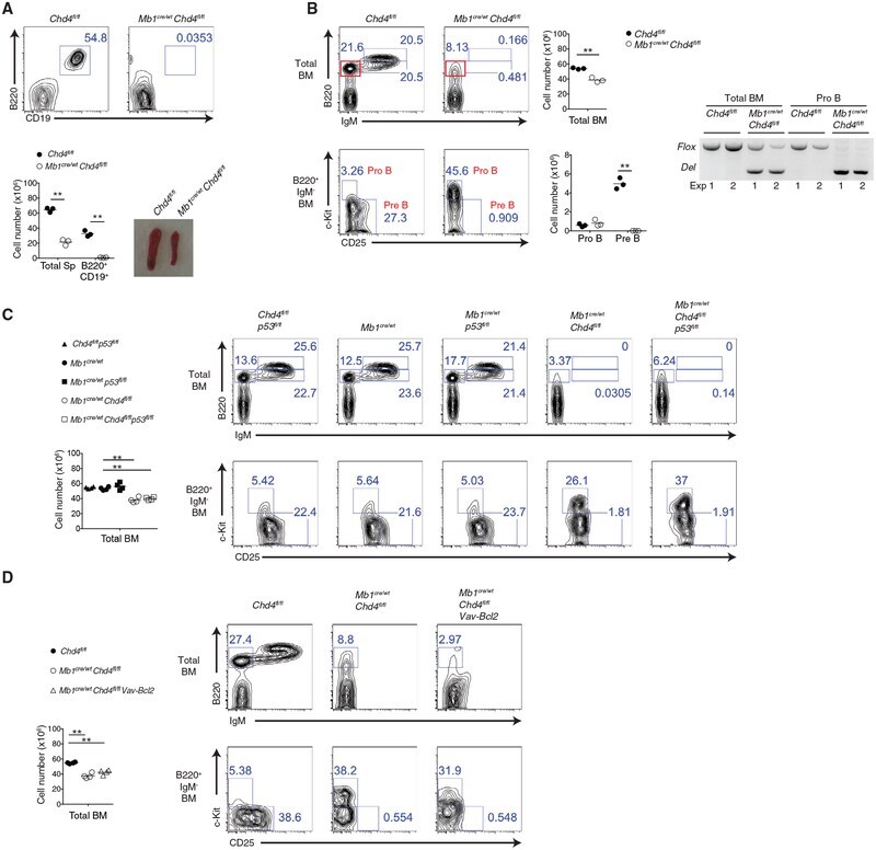 - Figure 2. CHD4 Is Essential for Early B Cell Development (A) Mature B cells are absent in spleens of Mb1 cre/wt Chd4 fl/fl mice. Splenocytes were stained with B220 and CD19 and analyzed using flow cytometry (top panel). Absolute numbers of total splenocytes and CD19 + B220 + B cells from each mouse strain are shown (n = 3; **p < 0.005) (bottom left). The spleen from a representative 10-week-old Mb1 cre/wt Chd4 fl/fl mouse was compared with littermate control ( Chd4 fl/fl ) (bottom right). (B) CHD4 deletion impairs early B cell development in the bone marrow. Flow cytometric analysis shows expression of IgM and B220 in the bone marrow. Cellularity of bone marrow is shown on the right side of representative flow plots. BM cells were stained with c-Kit and CD25 and analyzed for pre-B (IgM - B220 + CD25 + c-Kit - ) and pro-B (IgM - B220 + CD25 - c-Kit + ) cells. The red box represents the parent gate for analysis of pre-B and pro-B cells. n = 5; **p < 0.005. Furthermost right panel shows PCR-based genotyping and loss of the fl cel Chd4 allele in total bone marrow cells and sorted pro-B cells. Genotyping PCR from two independent experiments is shown. (C) Loss of p53 does not restore B cell developmental defects in Mb1 cre/wt Chd4 fl/fl mice. Absolute numbers of bone marrow from each mouse strain are shown (n = 4; **p < 0.005) (left). Flow cytometric analysis shows expression of IgM and B220 expression or CD25 and c-Kit in bone marrow (BM) (right). (D) Transgenic expression of Bcl2