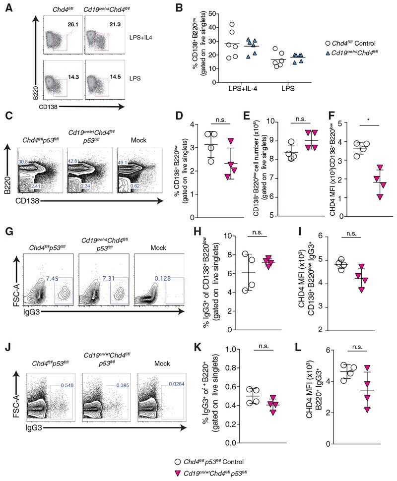 - Figure 6. CHD4 Is Dispensable for Plasma-blast Differentiation (A and B) Naive splenic B cells from control ( CHD4 fl/fl ) or CHD4 KO ( Cd19 cre/wt Chd4 fl/fl ) mice were stimulated in vitro with LPS alone or LPS plus IL-4 for 96 h, and formation of B220 lo CD138 + plasmablasts was examined. (A) Representative flow cytometry data. (B) Frequency of B220 lo CD138 + plasmablast for- mation in vitro (n = 5). (C-L) Mice were intravenously injected with 50 mg LPS or PBS (mock) and analyzed at day 5. (C) Representative flow cytometry plot for B220 lo CD138 + plasmablasts. Mock represents Chd4 fl/fl p53 fl/fl animals injected with PBS. (D) Frequency of plasmablasts (B220 lo CD138 + of live cells). (E) Absolute number of plasmablasts (B220 lo CD138 + live cells). (F) Intracellular staining of CHD4 within plasma- blast population (B220 lo CD138 + of live cells). (G) Representative flow cytometry plot of IgG3 intracellular staining of B220 lo CD138 + live cell population. Mock represents Chd4 fl/fl p53 fl/fl animals injected with PBS. (H) Frequency of IgG3 + plasmablasts (amongst B220 lo CD138 + live cells). (I) MFI of CHD4 expression in IgG3 positive plasmablasts. (J) Representative flow cytometry plot for IgG3 cells within the B220 + live cell population. Mock represents Chd4 fl/fl p53 fl/fl animals injected with PBS. (K) Frequency of IgG3 CSR upon LPS administration among total B220 + cells. (L) Intracellular staining of CHD4 in IgG3-positive B cells. Mice used in (C-L): n = 3 contro