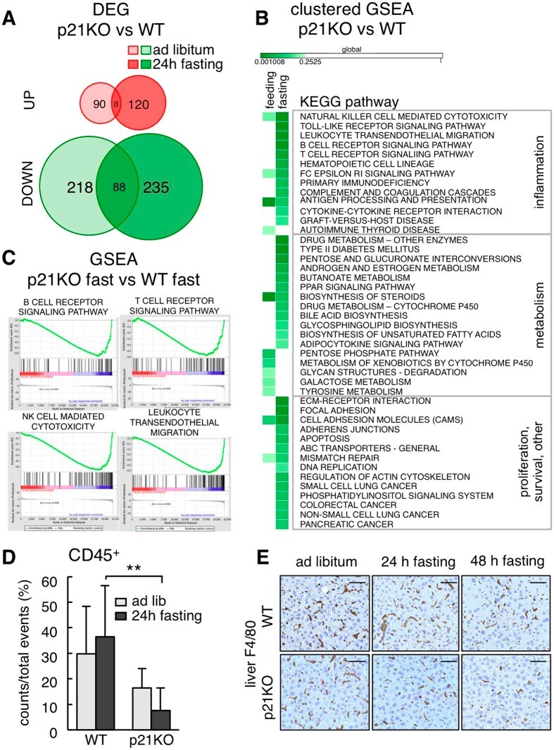 - Figure 4 Global transcription changes in p21 Cip1 -deficient mice. ( A ) Differentially expressed genes (DEG) in the liver of p21KO compared to WT mice under ad libitum feeding conditions and upon 24 h fasting. Data were obtained from RNA-Seq analysis of 2-3 male mice per group. Red circles correspond to upregulated and green circles to downregulated genes. Values were considered significant when FDR value was q < 0.05. ( B ) Heat map of significantly altered pathways in the liver in the same samples as in panel A. Results were obtained from GSEA and considered significant when FDR < 0.25. ( C ) Representative GSEA plots of immune-related pathways downregulated in fasted p21KO mice compared to fasted controls. FDR < 0.25. ( D ) Relative amount of CD45 + immune cells in the liver of ad libitum fed and 24 h fasted WT and p21KO mice. Values correspond to average +- s.d. (n = 6 males, 12-16 weeks old). ( E ) Representative pictures of F4/80 stained liver sections of WT and p21KO mice under feeding conditions, 24 h and 48 h fasting. Bars correspond to 50 mum. Statistical significance was determined by two-way ANOVA and Bonferroni post-hoc test: **p < 0.01. See also Figure S3 .