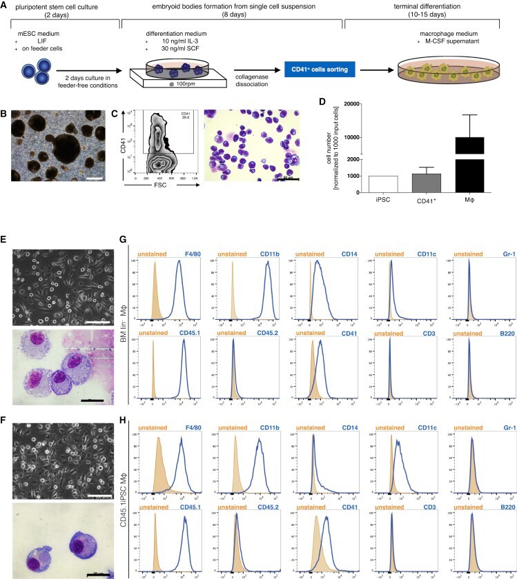 - Figure 2 Differentiation of iPSCs into Mphi (A) Schematic representation of the three step EB-based protocol employed for hematopoietic differentiation. (1) embryoid bodies (EBs) are formed for 8 days in the presence of 10 ng/ml IL-3 with 30 ng/ml SCF added from day 5 onward; (2) EBs are dissociated to single cells and CD41 + cells are isolated by fluorescence-activated cell sorting; and (3) terminal differentiation is achieved by 10-15 days of adherent culture in the presence of 30% M-CSF containing supernatant (L929 cells). (B) Representative picture of EBs at day 8. Scale bar, 500 mum. (C) Flow cytometric analysis of CD41 expression on day 8 and representative picture of May-Grunwald/Giemsa-stained cytospins of CD41 + cells. Scale bar, 50 mum. (D) Approximately 10-fold increase in cell number during differentiation (independent experiments, n = 3, mean +- SD). (E and F) Representative pictures of (E) BMlin - -Mphi and (F) CD45.1 iPSC-Mphi in bright-field and in May-Grunwald/Giemsa-stained cytospins. Scale bars, 100 mum and 20 mum. (G and H) Exemplary flow cytometry plots for expression of surface markers F4/80, CD11b, CD14, CD11c, Gr-1, CD45.1, CD45.2, CD41, CD3, and B220 on BMlin - -Mphi (G) and CD45.1iPSC-Mphi (H).