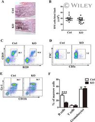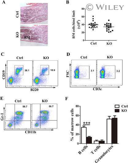 - mTORC1 inactivation in osterix-expressing cells results in decreased B-cell populations in the BM. ( A ) General images for H&E-stained femur BM sections of control and Osx-Raptor mice. Microphotographs were taken at x10 magnification. ( B ) BM cellularity in control and Osx-Raptor mice ( n = 19 control, n = 17 Osx-Raptor). ( C ) FACS plots of total B lymphocytes (B220 + CD19 + ) in the BM of control and Osx-Raptor mice. ( D ) FACS plots of T lymphocytes (CD3 + ) in the BM of control and Osx-Raptor mice. ( E ) FACS plots of granulocytes (CD11b + Gr-1 + ) in the BM of control and Osx-Raptor mice. ( F ) Total percentages of B lymphocytes, T lymphocytes, and granulocytes. Numbers in each region represent the percentage of cells in the total population ( n = 4 control, n = 5 Osx-Raptor). Both male and female mice at 3 weeks of age were used for experiments. Error bars in bar graphs are SE; *** p < 0.001.