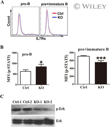 - IL-7/IL-7R/Stat5 and Erk signaling are dysregulated in different B-cell stages in Osx-Raptor mice. ( A ) IL-7Ralpha expression in B-cell subsets was analyzed by FACS. Subsets were defined as follows: pro-B cells = B220 + CD43 + ; pre-B plus immature B cells = B220 + CD43 - ( n = 4). ( B ) The levels of p-Stat5 in B-cell subsets were analyzed by FACS. ( n = 4) ( C ) The levels of p-Erk in total B-cells were analyzed by Western blot assay. Both male and female mice at 3 weeks of age were used for experiments. Error bars in bar graphs are SE; * p < 0.05; *** p < 0.001. p-Stat5 = phosphorylated Stat5; p-Erk = phosphorylated Erk; MFI = mean fluorescence intensity.