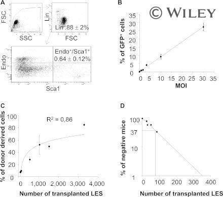 - Characterization of the hematopoietic stem cell enriched LES population. (A): Purification of LES cells: Endo + Sca.1 + cells sorted from lineage (B220, CD11b, GR1, Ter119, CD8a, CD4, and CD5) negative population. (B): Percentage of eGFP + LES cells 7 days after transduction at increasing MOI. (C): Percentage of CD45.1 donor-derived cells, in whole blood of primary recipient mice 16 weeks after transplantation and quantified by flow cytometry versus the number of injected cells. (D): Limiting dilution analysis showing the percentage of mice containing fewer than 1% of donor CD45.1 in WBC versus the number of injected cells. Data were obtained by flow cytometry 16 weeks after transplantation. Abbreviations: FSC, Forward Scatter; GFP, green fluorescent protein; LES, Lin - Endoglin + Sca.1 + ; MOI, multiplicity of infection; SSC, Side Scatter.