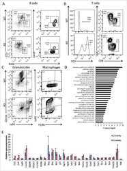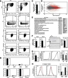 - Figure 5 Differentiation of miPAP1 into Mphi (A and B) Representative picture of (A) bright-field EBs at day 8 of differentiation (scale bar, 500 mum) and (B) flow cytometric analysis of CD41 expression. (C) Representative pictures of (upper picture; scale bar, 100 mum) bright-field microscopy and (lower picture; scale bar, 20 mum) May-Grunwald/Giemsa-stained cytospins of miPAP1-Mphi. (D) Flow cytometric analysis of surface marker expression (data for F4/80, CD11b, CD14, CD11c, Gr-1, CD45.1, CD45.2, CD41, CD3, and B220).