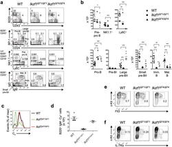 - Figure 2 B cell development is disrupted at different stages in Ikzf1 DeltaF1/DeltaF1 and Ikzf1 DeltaF4/DeltaF4 mice. ( a ). B-cell development was analyzed in whole bone marrow from 6- to 8-week-old mice. One representative experiment out of three or more is shown. Staining is shown for total bone marrow in row 1, pre-pro B to large pre-BII (B220 + CD43 + ) cells in row 2, lineage (Lin) - B220 + CD43 + CD19 - cells (for analysis of pre-pro B) in row 3, and small pre-BII to mature B (B220 + CD43 - ) cells in row 4. The average percentage of the indicated population in total bone marrow is shown. Lineage markers included CD3, TER119, Gr-1, and CD11b. ( b ) Absolute numbers of the indicated populations in total bone marrow of wild-type (n=13), Ikzf1 DeltaF1/DeltaF1 (n=6) and Ikzf1 DeltaF4/DeltaF4 (n=6-8) mice are shown. Each symbol represents an individual mouse and bar shows the mean. * P