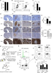 - Fig. 1 In vivo depletion of Cdkn1a rescues GC formation in Ezh2 -/- mice. Ezh2 fl/fl , Cdkn1a -/- , Ezh2 fl/fl ;Cgamma1-cre and Ezh2 fl/fl ;Cgamma1-cre; Cdkn1a -/- littermate mice were immunized with SRBC to induce germinal center (GC) formation and were killed 10 days later. a Flow cytometry plot of one representative mouse spleen per group. The gated area shows the percentage of GC B cells (GL7 + FAS + ) within live B cells (B220 + DAPI-, see Supplementary Fig. 2A for gating strategy). b Average of GC B populations of each group of mice quantified by flow cytometry as in a ( n = 7 mice per group). c Formalin fixed paraffin embedded splenic tissue was stained for PNA, Ki67, EZH2, and B220. One representative picture of three spleens analyzed per group is shown. d - f Quantification of PNA staining from c ( n = 3 spleens per group). d ""#GC/spleen section"" is the count of all GC per spleen section. e ""GC area/total spleen area"" is the quantified area of each individual GC divided by the total area of the spleen section. f ""Total GC area/total spleen area"" is the sum of all GC quantified areas in a certain section divided by the total area of that spleen section. g Splenocytes were permeabilized and stained for GC B and EZH2 using a fluorochrome-conjugated anti EZH2 antibody. The gated area shows the percentage of GC B cells (GL7 + FAS + ) within live B cells (B220 + DAPI-, see Supplementary Fig. 2A for gating strategy) that are EZH2 positive. The flow plot shown is repre