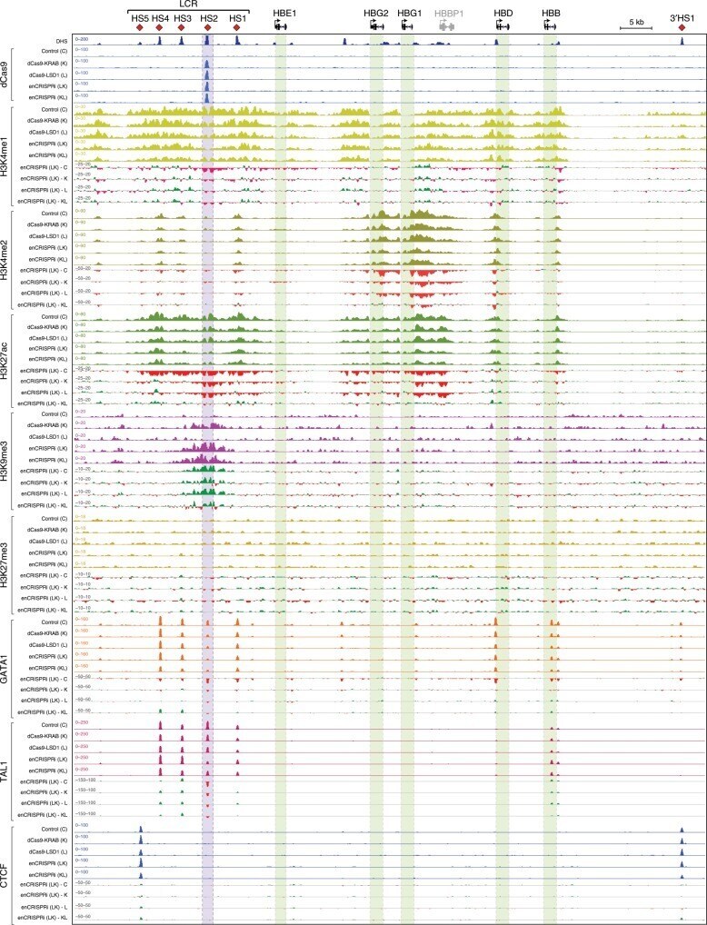 - Fig. 3 Locus-specific epigenetic reprogramming at the beta-globin gene cluster. Density maps are shown for ChIP-seq of dCas9, active histone marks (H3K4me1, H3K4me2, and H3K27ac), repressive H3K9me3 and H3K27me3, GATA1, TAL1, and CTCF at the beta-globin cluster (chr11: 5,222,500-5,323,700; hg19) in K562 cells coexpressing nontargeting sgGal4 (control or C) or sgHS2 with dCas9-KRAB (K), dCas9-LSD1 (L) or enCRISPRi (LK and KL). Regions showing increased or decreased ChIP-seq signals in enCRISPRi (LK) relative to control, dCas9-KRAB, dCas9-LSD1 or enCRISPRi (KL) (enCRISPRi--C, enCRISPRi--K, enCRISPRi--L, or enCRISPRi--KL) are depicted in green and red, respectively. Blue bars denote the sgRNA-targeted HS2 enhancer. Green bars denote the beta-globin genes. Independent replicate experiments are shown as rep1 and rep2 in Supplementary Figs. 2 and 3 , respectively.