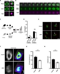 - Fig. 6 Peripheral F-actin ring formation is impaired in the IS of mDia1/3-deficient naive CD8 T cells. ( A ) Representative TIRF images of TCRbeta and mDia1 in the IS of a naive CD8 OT-I T cell fixed at 3 min after stimulation on an SLB. Scale bar, 5 mum. ( B ) Representative TIRF images of TCR microclusters together with EGFP-mDia1 in a CD8 OT-I T blast stimulated on an SLB. Time is relative to initial cell-SLB contact. Scale bar, 5 mum. ( C ) Scheme of the experimental design for the cell conjugation assay for control OT-I or mDia1/3 cDKO naive CD8 OT-I T cells cocultured with SL8 peptide-loaded splenic B cells. Naive CD8 OT-I T cells from control mice or tamoxifen-induced mDia1/3 cDKO mice and SL8 peptide-loaded splenic B cells were mixed at a one-to-one ratio, centrifuged, and then incubated for 15 min. After fixation, conjugated cells were stained with phalloidin. Half of the stained cells were then analyzed by FACS, while the remaining cells were subjected to F-actin staining and imaging by confocal microscopy. ( D ) Percentage of cell conjugates from coculture assays, as determined by FACS. Data are from three independent experiments. Bars represent means +- SEM. n.s. = not significant (one-way ANOVA with post hoc test). ( E ) Representative confocal image stacks of cell conjugates from control (upper) and mDia1/3 cDKO (lower) naive CD8 OT-I T cells cultured with SL8 peptide-pulsed splenic B cells. Cells were labeled with anti-B220 antibody (red) and phalloidin (green)