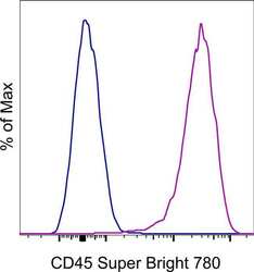 - Normal human peripheral blood cells were stained with Mouse IgG1 kappa Isotype Control, Super Bright 780 (Product # 78-4714-82) (blue histogram) or CD45 Monoclonal Antibody, Super Bright 780 (purple histogram). Cells in the lymphocyte gate were used for analysis.
