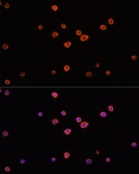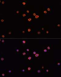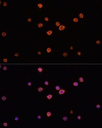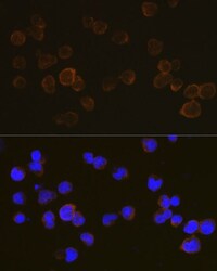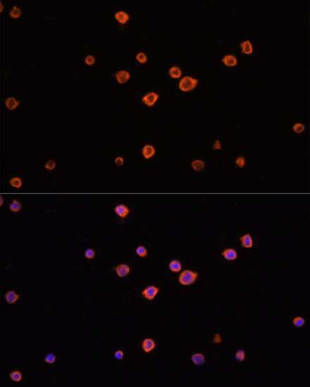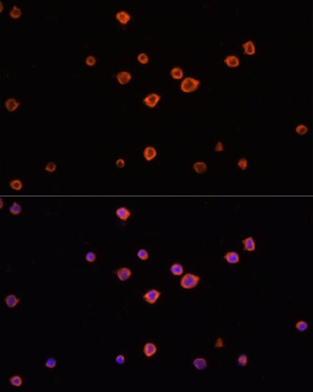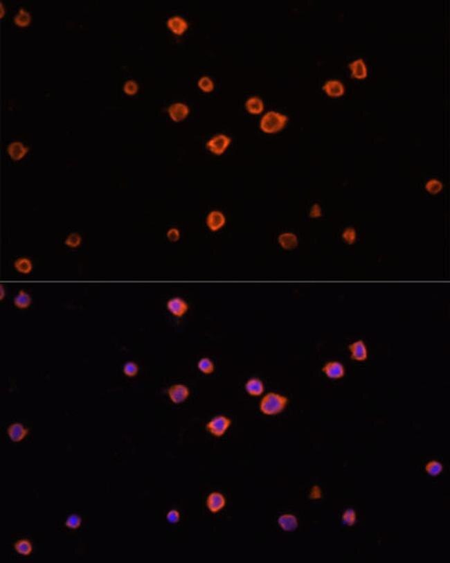 - Immunofluorescence analysis of Jurkat cells using PTPRC Polyclonal antibody (Product # PA5-87427) at dilution of 1:100. Blue: DAPI for nuclear staining.