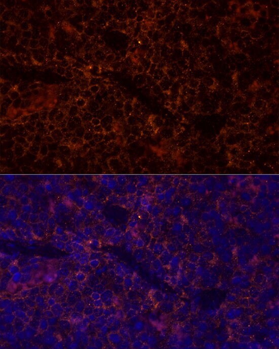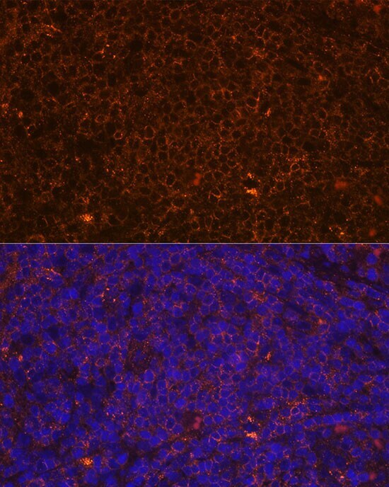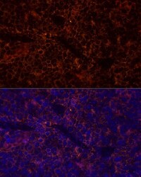 - Immunofluorescence analysis of CD45 in mouse spleen cells. Samples were incubated with CD45 Polyclonal antibody (Product # PA5-87427) using a dilution of 1:100 (40x lens). Blue: DAPI for nuclear staining.