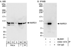 - Detection of human and mouse NARG1 by western blot (h&m) and immunoprecipitation (h). Samples: Whole cell lysate from HeLa (5, 15 and 50 µg for WB; 1 mg for IP, 20% of IP loaded), 293T (T; 50 µg) and mouse NIH3T3 (M; 50µg) cells. Antibodies: Affinity purified rabbit anti-NARG1 antibody A302-147A used for WB at 0.04 µg/ml (A) and 1 µg/ml (B) and used for IP at 3 µg/mg lysate. NARG1 was also immunoprecipitated, albeit poorly, by rabbit anti-NARG1 antibody BL8491, which recognizes an upstream epitope. Detection: Chemiluminescence with exposure times of 10 seconds (A and B).