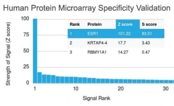 - Analysis of HuProt(TM) microarray containing more than 19,000 full-length human proteins using Estrogen Receptor alpha antibody (clone ESR1/1935). These results demonstrate the foremost specificity of the ESR1/1935 mAb. Z- and S- score: The Z-score represents the strength of a signal that an antibody (in combination with a fluorescently-tagged anti-IgG secondary Ab) produces when binding to a particular protein on the HuProt(TM) array. Z-scores are described in units of standard deviations (SDs) above the mean value of all signals generated on that array. If the targets on the HuProt(TM) are arranged in descending order of the Z-score, the S-score is the difference (also in units of SDs) between the Z-scores. The S-score therefore represents the relative target specificity of an Ab to its intended target.
