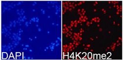 - ICC/IF analysis of 293T cells using Histone H4K20me2 (di-methyl Lys20) antibody (red) and DAPI (blue).