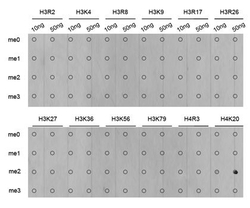 - Dot-blot analysis of all sorts of methylation peptides using Histone H4K20me2 (di-methyl Lys20) antibody.