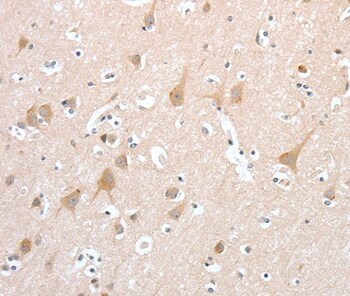 - Immunohistochemical analysis of PCDHB16 in paraffin embedded Human brain tissue using PCDHB16 Polyclonal Antibody (Product # PA5-50282) at a 1:30 dilution.