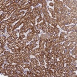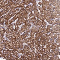- Immunohistochemical staining of human liver with C6orf165 polyclonal antibody (Cat # PAB24371) shows strong cytoplasmic positivity in hepatocytes at 1:50-1:200 dilution.