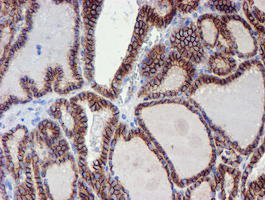 - IHC of paraffin-embedded Carcinoma of Human thyroid tissue using anti-ERBB2 mouse monoclonal antibody. (Heat-induced epitope retrieval by 10mM citric buffer, pH6.0, 100C for 10min).